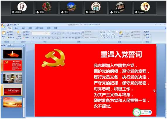 活动中,全体党员通过电脑或手机面向人民英雄纪念碑默哀三分钟,在云端为英烈献花,向为国捐躯的先烈表达无尽的哀思,向热烈燃烧的忠魂致以最高的敬意。王春梅老师带领师生党员重温入党誓词,铮铮誓言彰显了师生党员铭记历史,传承革命火种,弘扬英烈精神的坚定决心。