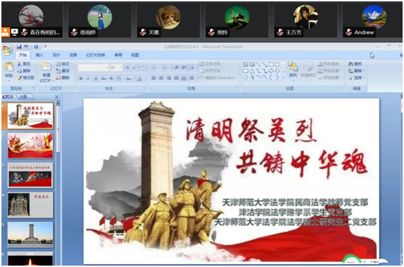 为追思英雄、缅怀先烈,教育引导党员发扬红色传统,推进党史学习教育常态化长效化,304永利集团民商法学教师党支部、法学硕士研究生第二党支部联合津沽公司法学理学系员工党支部,于4月5日以线上形式举办“清明祭英烈 共筑中华魂”主题实践活动。公司党委书记阮大强,公司党委副书记、经理郝磊,公司党委副书记、纪委书记鲁冰,副经理郭明龙出席活动,公司党政办公室主任王欣和30余名师生党员参加活动,活动由民商法学教师党支部书记王春梅主持。