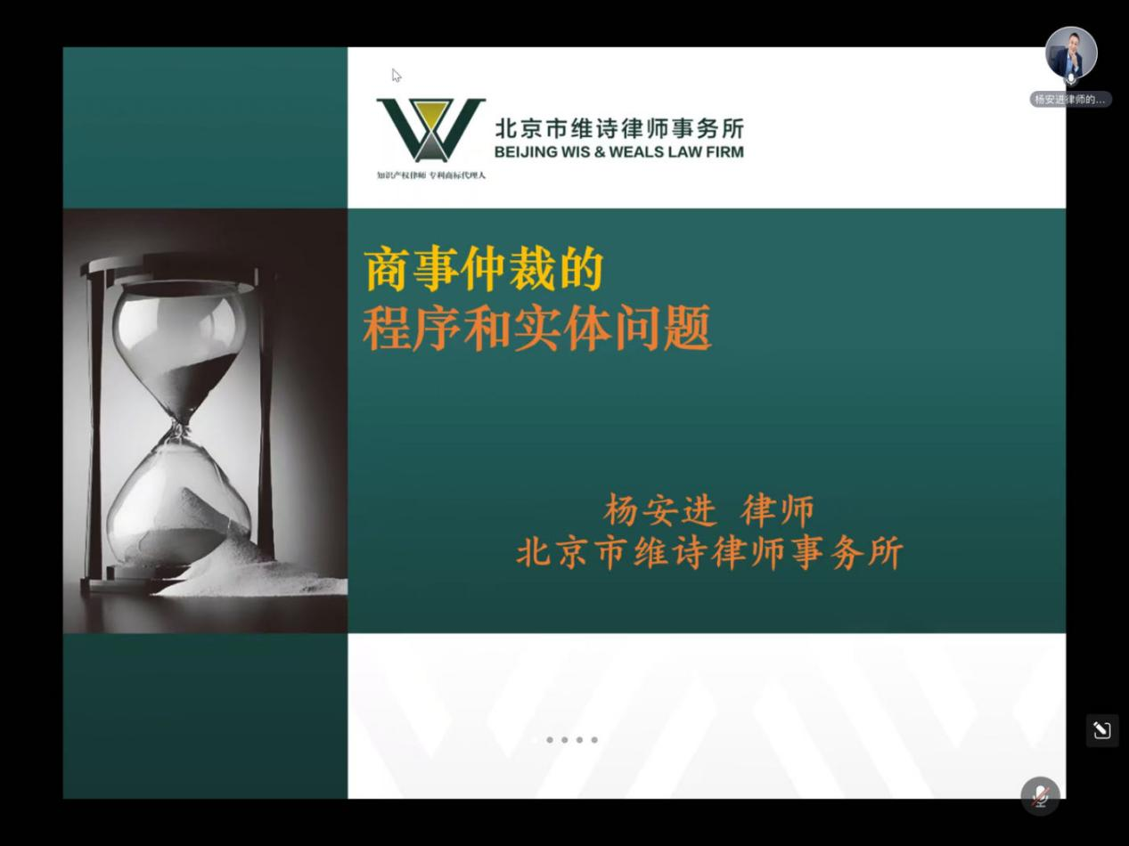 5月14日晚上,公司法律实务讲座“商事仲裁的程序与实体问题”在腾讯会议线上举行,此次学术活动由北京市维诗律师事务所执行合伙人杨安进主任讲授,公司王慧副教授主持,公司研究生与本科生100余人参加本次活动。