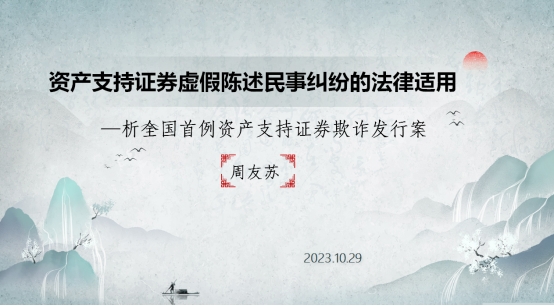 第四部分,周教授提出三个重要观点:第一,资产支持证券具有不同于股票和公司债券典型证券的特殊性,因此涉及资产支持证券的纠纷,不能简单地套用《证券法》和虚假陈述司法解释的有关规定;第二,学界、业界和司法界应当加大对具体案件中反映出来的问题的研究力度,为正确处理资产支持证券虚假陈述案件提供更多更好的建议;第三,监管部门和司法机关应针对资产支持证券的特点进一步完善相关的操作规则和纠纷解决的司法解释,推动国务院早日出台资产支持证券的行政法规。