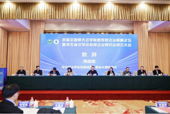 2023年12月9日至10日,首届全国师大法学联盟教育法治高峰论坛暨河北省法学会教育法治研究会成立大会在河北省石家庄市举办。来自全国50多所高校和河北省高级人民法院、河北省人民检察院、河北省教育厅、河北省司法厅等30余家司法机关、教育行政部门和律师事务所等实务部门代表200余人参加。会议由全国师大法学联盟、河北省法学会、河北师范大学主办,河北师范大学法政与公共管理公司、河北省法学会教育法治研究会(筹)承办。