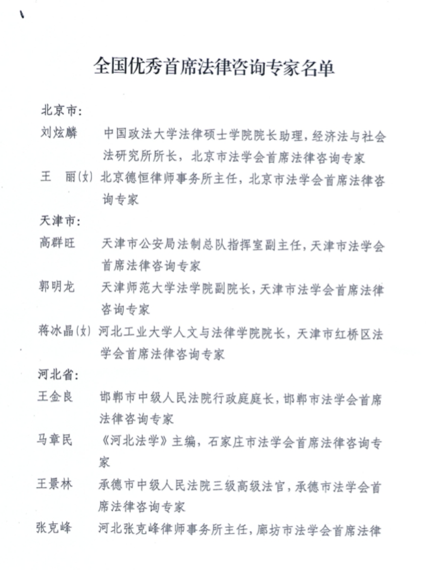 近日,为认真贯彻《中共中央办公厅国务院办公厅关于坚持和发展新时代“枫桥经验”提升社会矛盾纠纷预防化解能力的意见》, 激励全国首席法律咨询专家切实增强荣誉感和责任感,充分发挥典型示范作用,进一步推进首席法律咨询专家工作广泛深入开展,中国法学会在全国范围内评选出100名优秀首席法律咨询专家。公司副经理郭明龙教授作为天津市优秀首席法律咨询专家获得这一荣誉称号。根据中国法学会的决定,天津市共有3位首席法律咨询专家获得“全国优秀首席法律咨询专家”荣誉称号。
