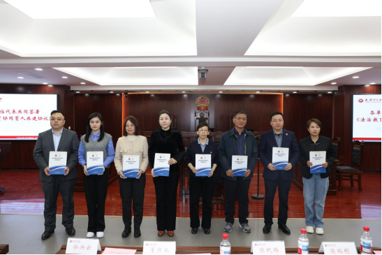 304永利集团与西青区人民法院、和平区人大小白楼街道工委、天津瑞景中学、天津南开公司鹏飞公司、南开实验公司、西青区精武镇燕南园社区、天津津瑞律师事务所共7家单位共同签署《法治教育协同育人共建协议》。