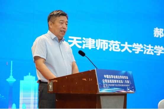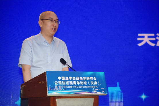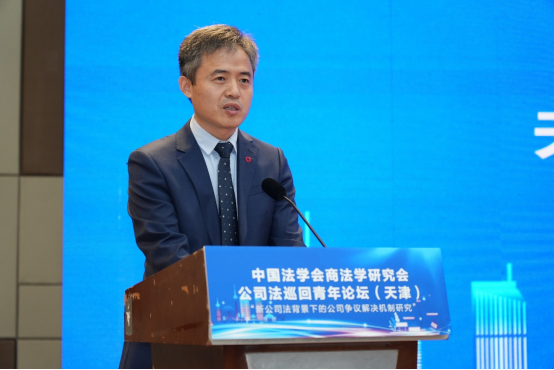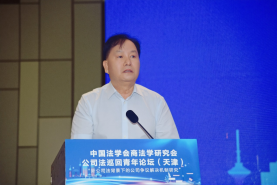 张劲枫代表天津市法学会对论坛的召开表示热烈祝贺。他表示,论坛以“青年”为主体,聚焦“公司法”,充分体现了中国法学会商法学研究会对青年才俊培养的高度重视,具有推动公司法理论与实务研究不断深化的战略眼光,新公司法的实施为公司法治翻开了崭新篇章,对公司争议解决的理论与制度实践提出了更高要求,天津市法学会素来重视推动本市专家学者与全国法学界的沟通交流,举办论坛有助于为大家提供交流思想、碰撞智慧的平台,期望青年学者和实务工作者深入探讨,畅所欲言,高度关注新法实施后涌现的新型、疑难、复杂案件类型及裁判思路,为深入理解和准确适用新公司法贡献“青年智慧”和“青年方案”。